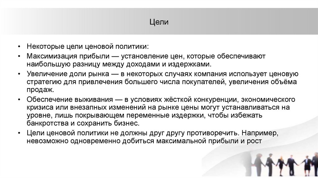 • Цели ценовой политики не должны друг другу противоречить. Например,