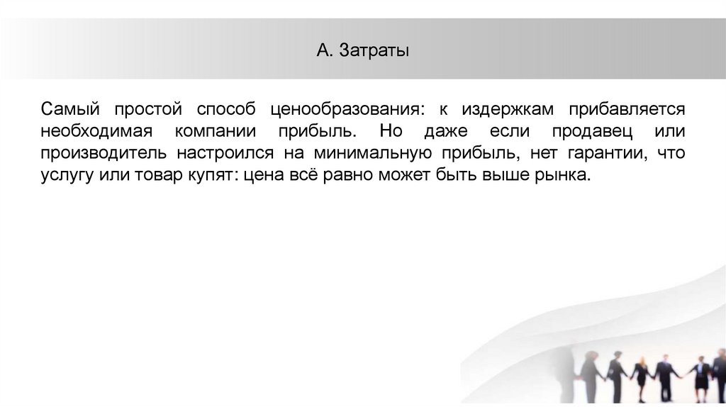 А. ЗатратыСамый простой способ ценообразования: к издержкам прибавляется