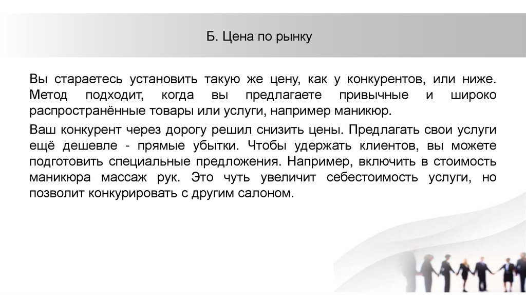 Б. Цена по рынкуВы стараетесь установить такую же цену, как у конкурентов, или ниже.