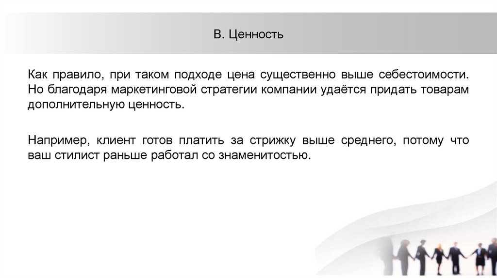 В. ЦенностьКак правило, при таком подходе цена существенно выше себестоимости.
