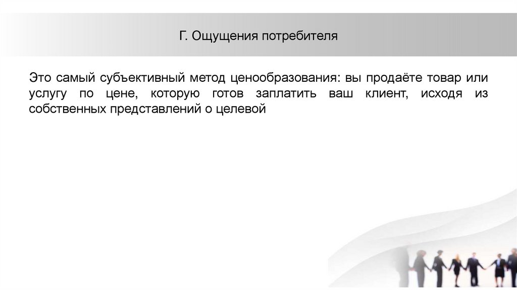Г. Ощущения потребителяЭто самый субъективный метод ценообразования: вы продаёте товар или