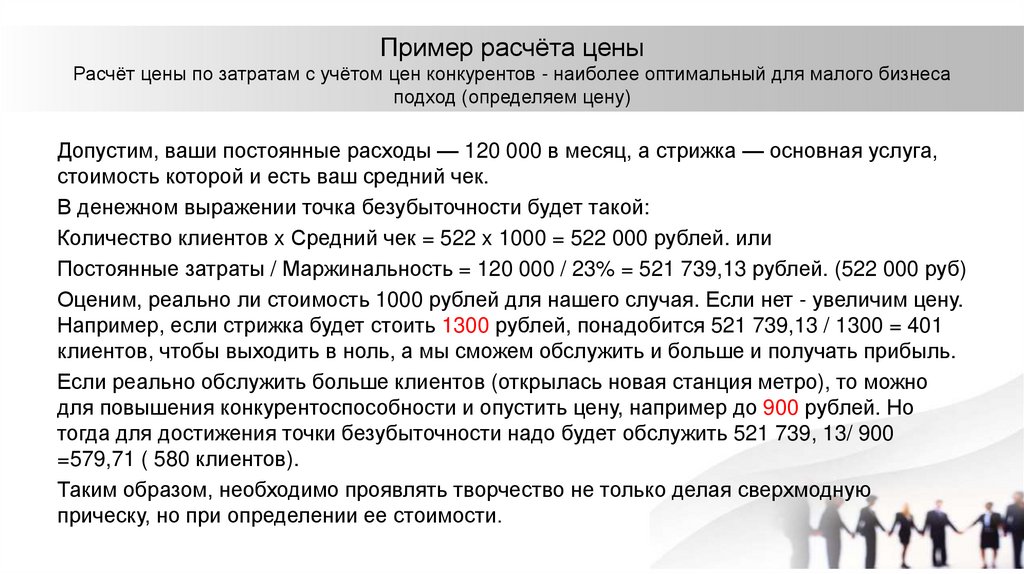 Пример расчёта ценыРасчёт цены по затратам с учётом цен конкурентов - наиболее оптимальный для малого бизнеса