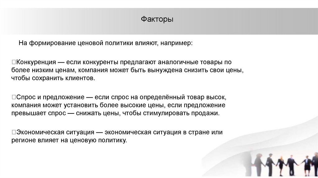 ФакторыНа формирование ценовой политики влияют, например: