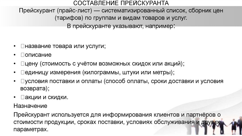 СОСТАВЛЕНИЕ ПРЕЙСКУРАНТАПрейскурант (прайс-лист) — систематизированный список, сборник цен
