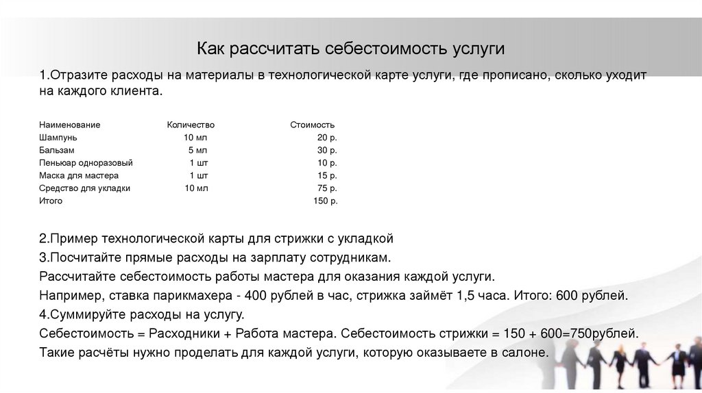 Как рассчитать себестоимость услуги1.Отразите расходы на материалы в технологической карте услуги, где прописано, сколько уходит