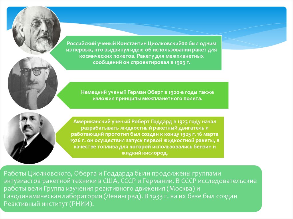 Работы Циолковского, Оберта и Годдарда были продолжены группами