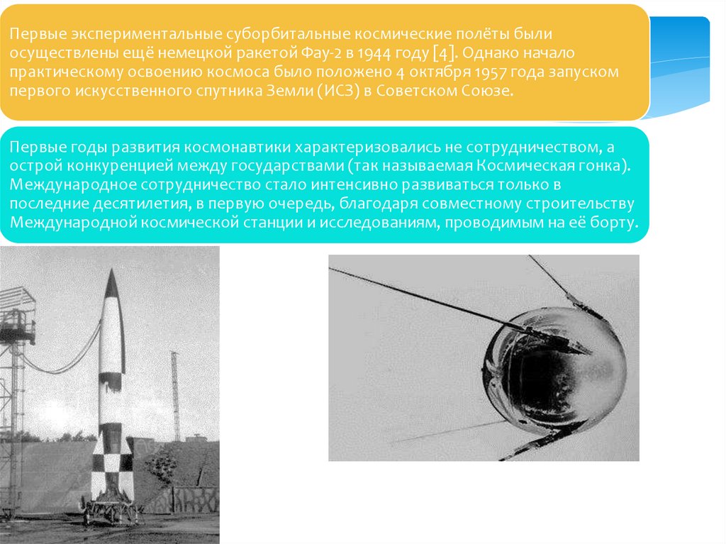 Первые экспериментальные суборбитальные космические полёты былиосуществлены ещё немецкой ракетой Фау-2 в 1944 году [4]. Однако начало