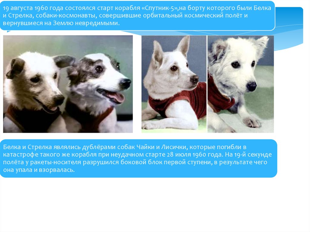 19 августа 1960 года состоялся старт корабля «Спутник-5»,на борту которого были Белкаи Стрелка, собаки-космонавты, совершившие орбитальный космический полёт и