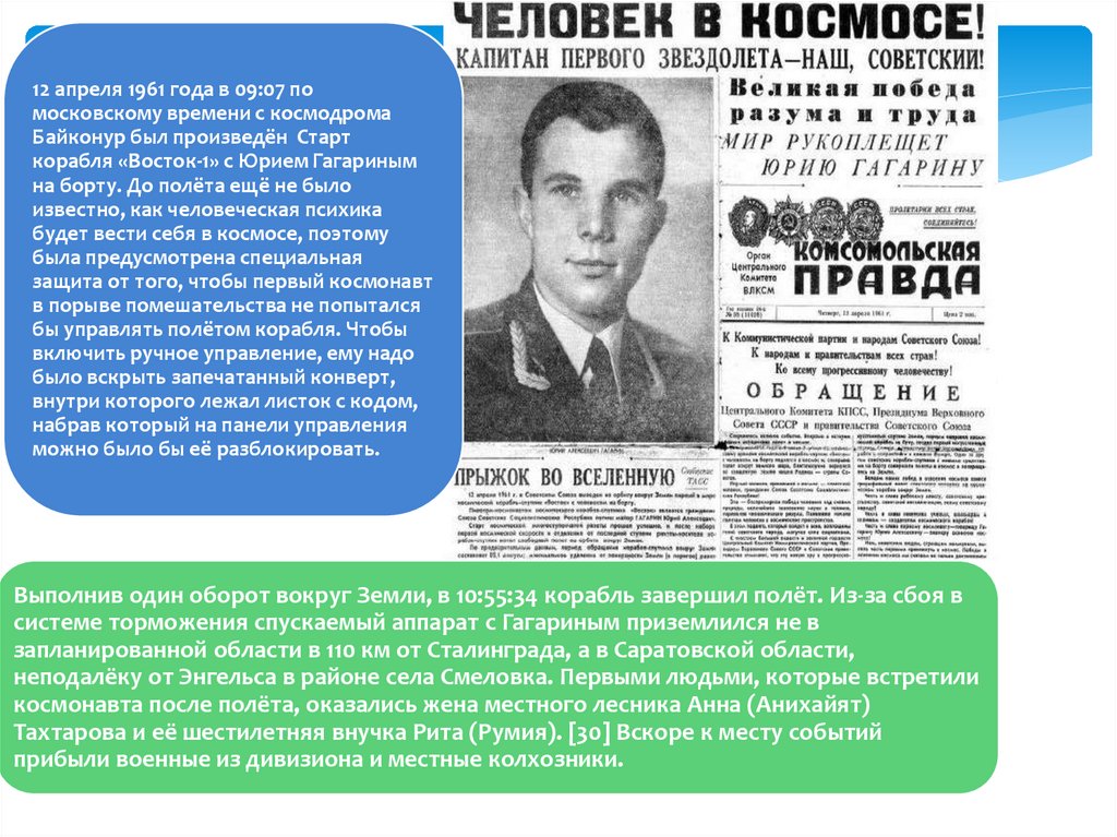 системе торможения спускаемый аппарат с Гагариным приземлился не в