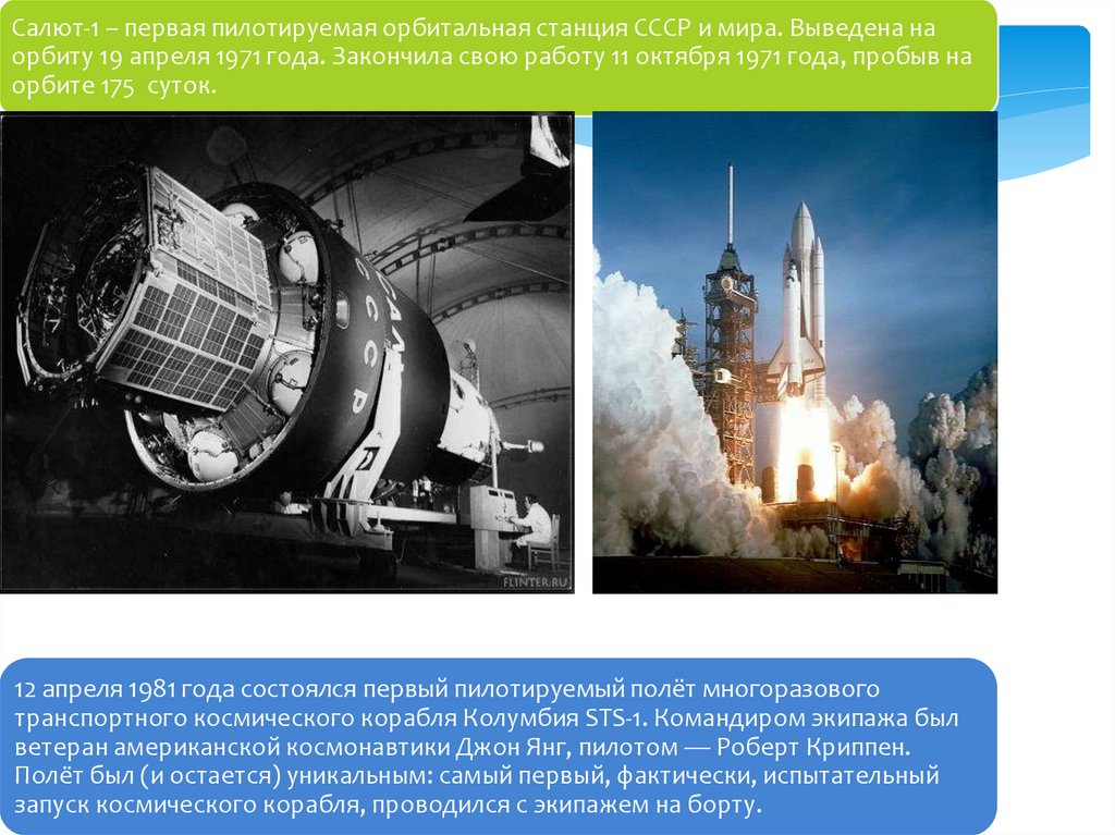 Салют-1 – первая пилотируемая орбитальная станция СССР и мира. Выведена наорбиту 19 апреля 1971 года. Закончила свою работу 11 октября 1971 года, пробыв на