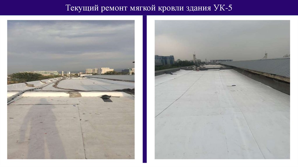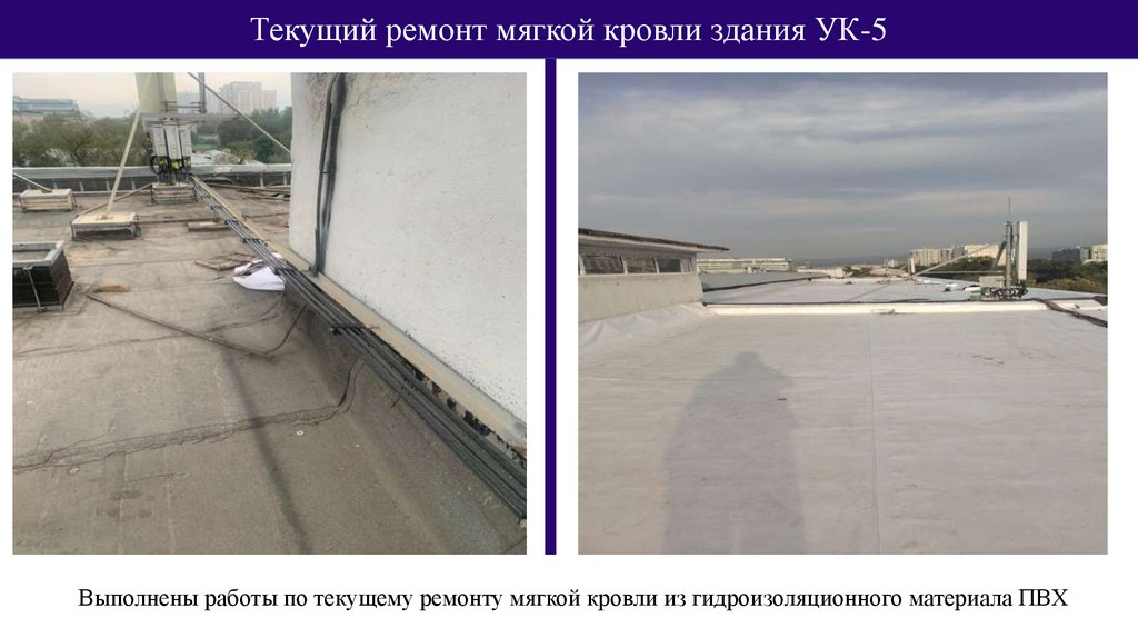 Текущий ремонт мягкой кровли здания УК-5Выполнены работы по текущему ремонту мягкой кровли из гидроизоляционного материала ПВХ