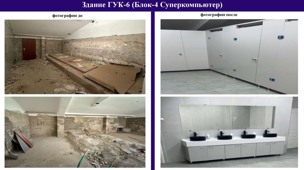 Здание ГУК-6 (Блок-4 Суперкомпьютер)Проведены демонтажные, монтажные работы и сантехнические работы в санузлах и входной группы.