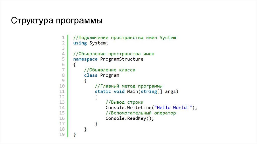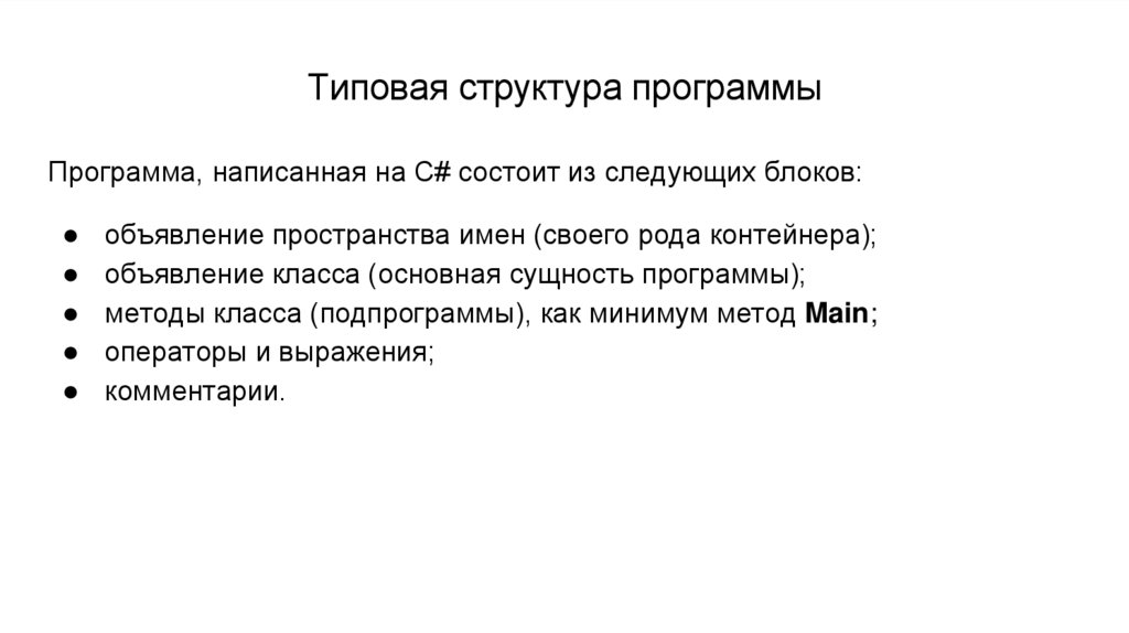 Типовая структура программыПрограмма, написанная на C# состоит из следующих блоков: