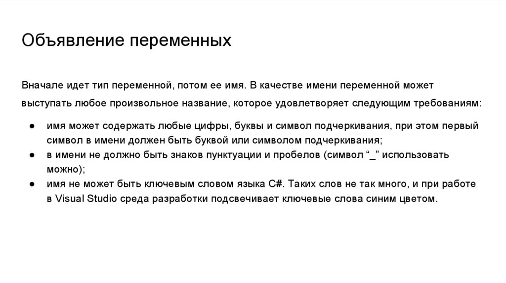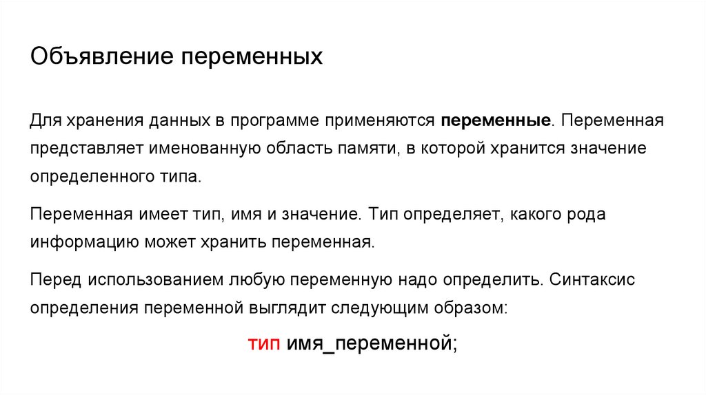 Объявление переменныхДля хранения данных в программе применяются переменные. Переменная