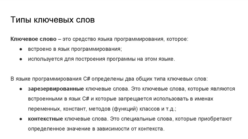 Типы ключевых словКлючевое слово – это средство языка программирования, которое: