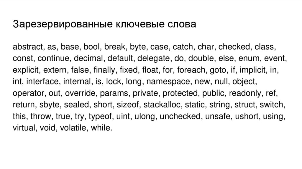 Зарезервированные ключевые словаabstract, as, base, bool, break, byte, case, catch, char, checked, class,