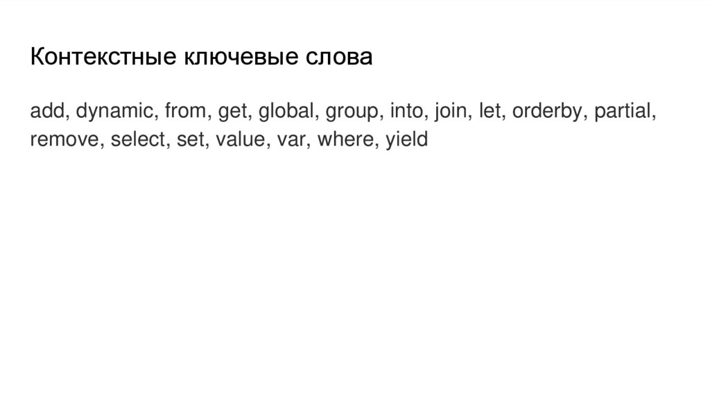 Контекстные ключевые словаadd, dynamic, from, get, global, group, into, join, let, orderby, partial,