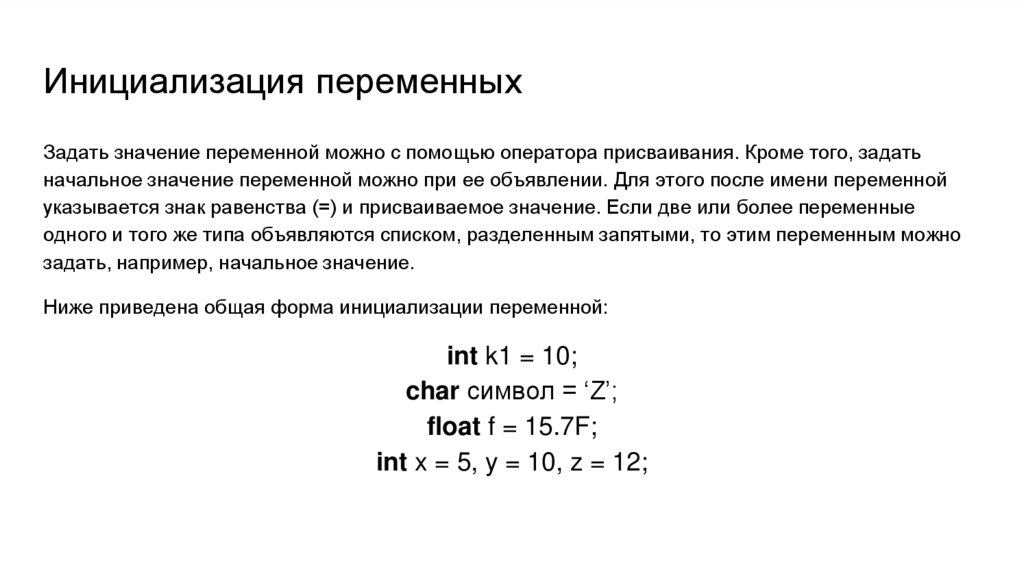 Инициализация переменныхЗадать значение переменной можно с помощью оператора присваивания. Кроме того, задать
