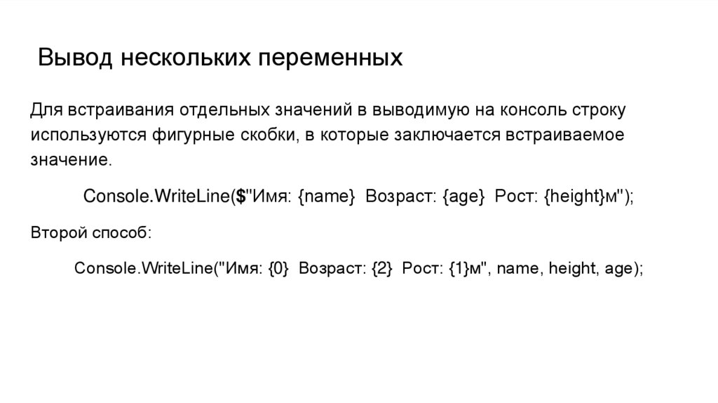 Вывод нескольких переменныхДля встраивания отдельных значений в выводимую на консоль строку