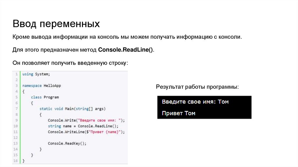 Ввод переменныхКроме вывода информации на консоль мы можем получать информацию с консоли.