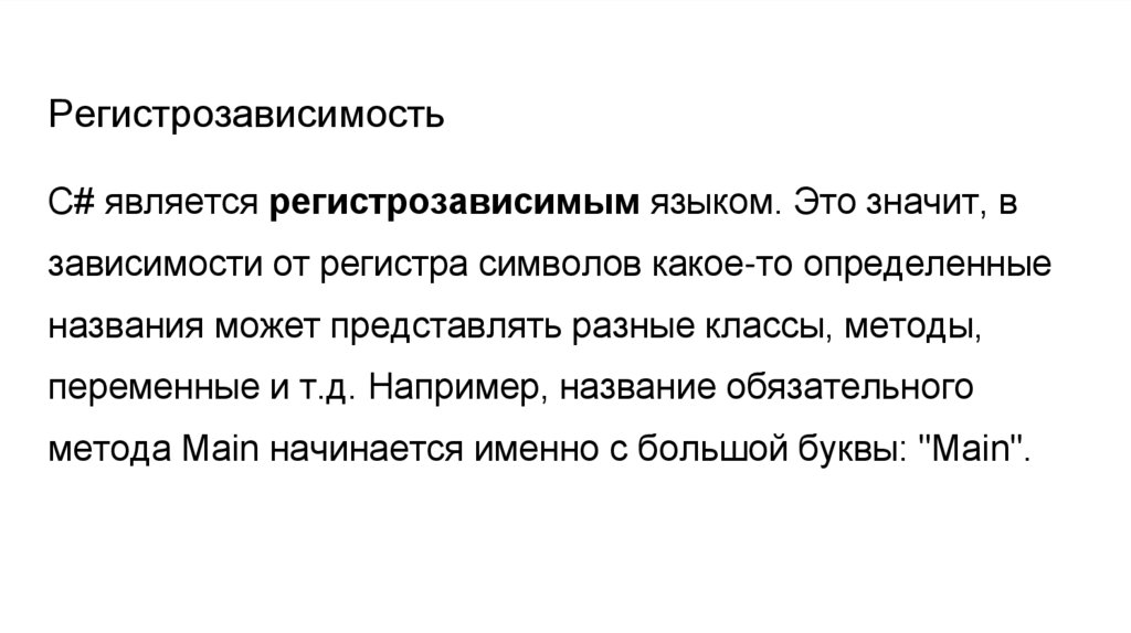 РегистрозависимостьC# является регистрозависимым языком. Это значит, в