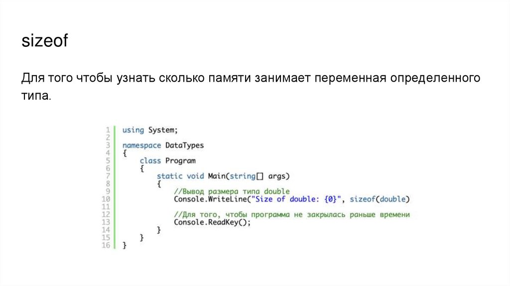 sizeofДля того чтобы узнать сколько памяти занимает переменная определенного
