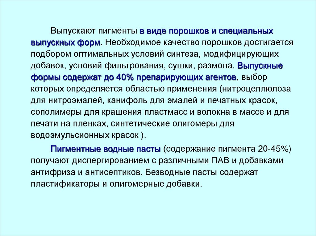 Выпускают пигменты в виде порошков и специальныхвыпускных форм. Необходимое качество порошков достигается
