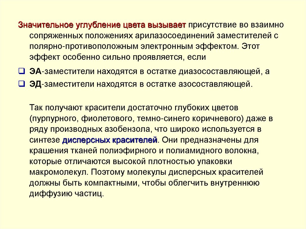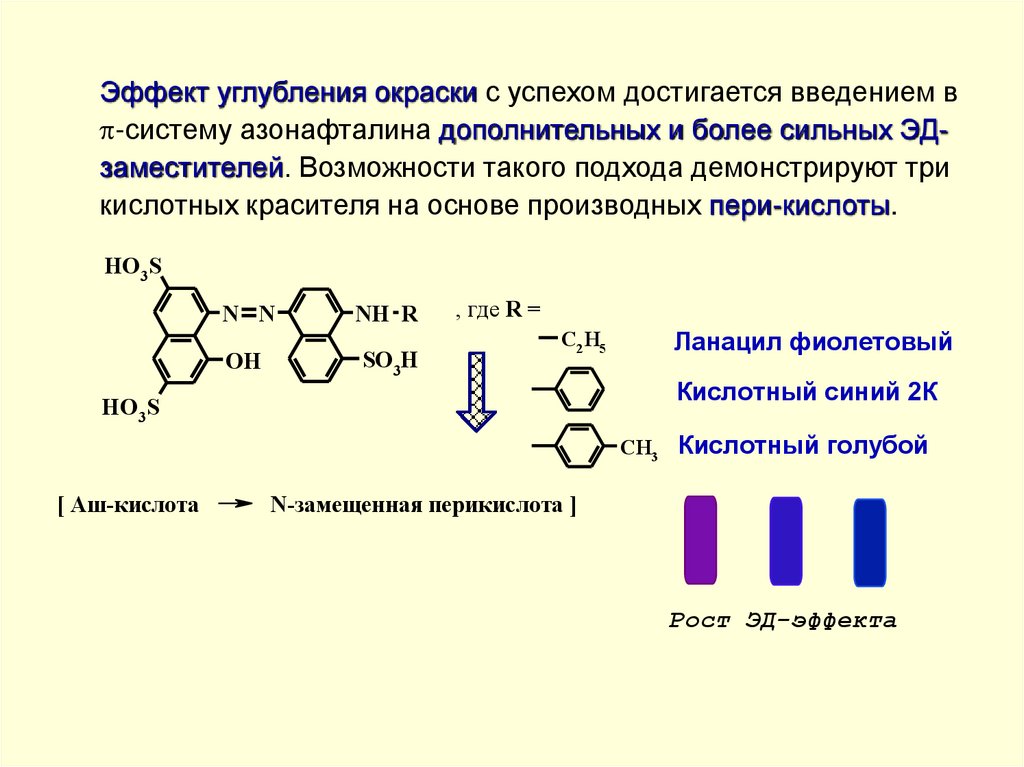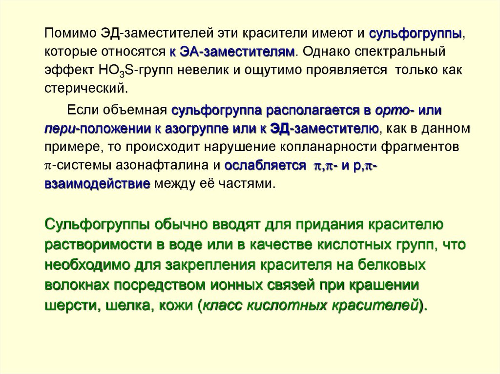 Помимо ЭД-заместителей эти красители имеют и сульфогруппы,которые относятся к ЭА-заместителям. Однако спектральный