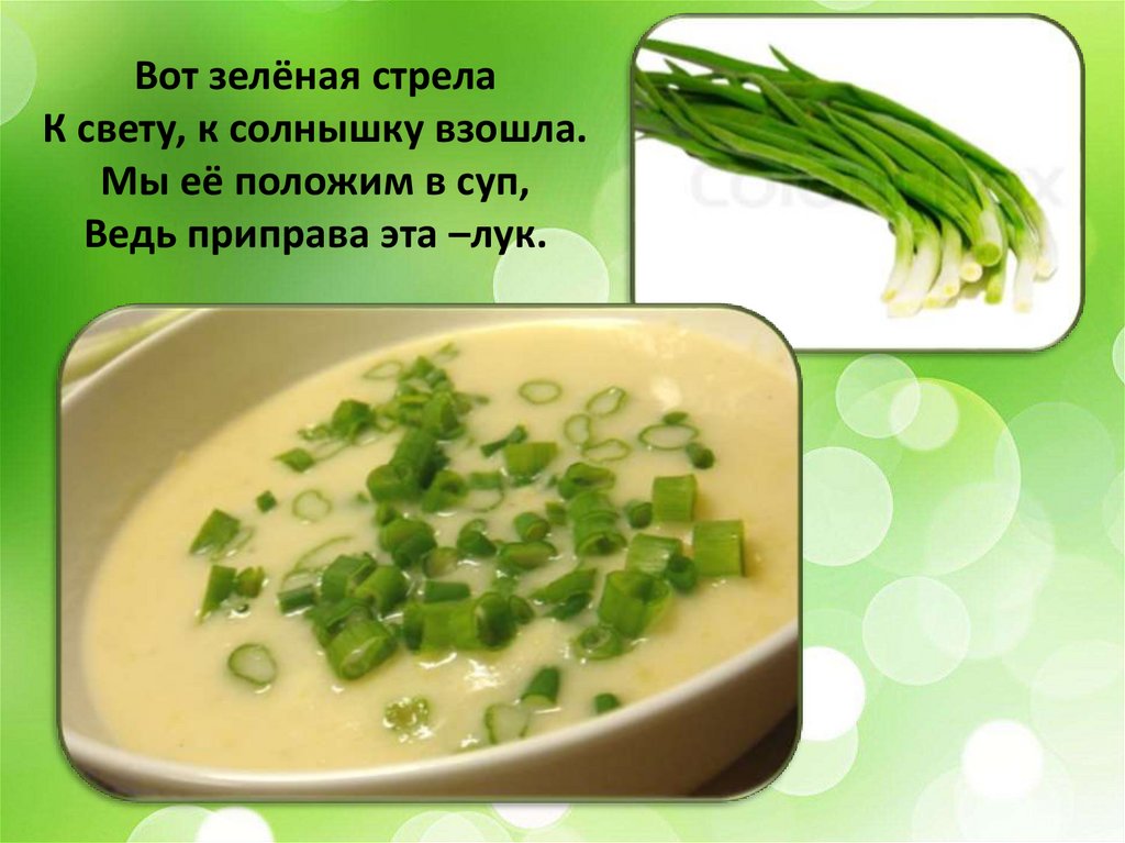 Лук зелёный – объеденье!Он приправа к блюдам.