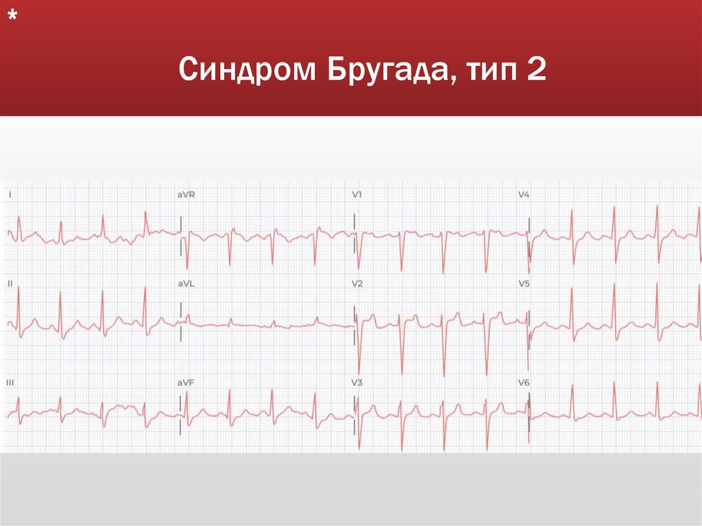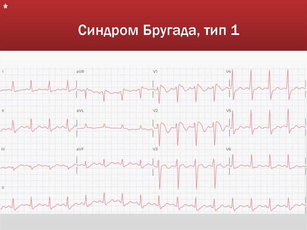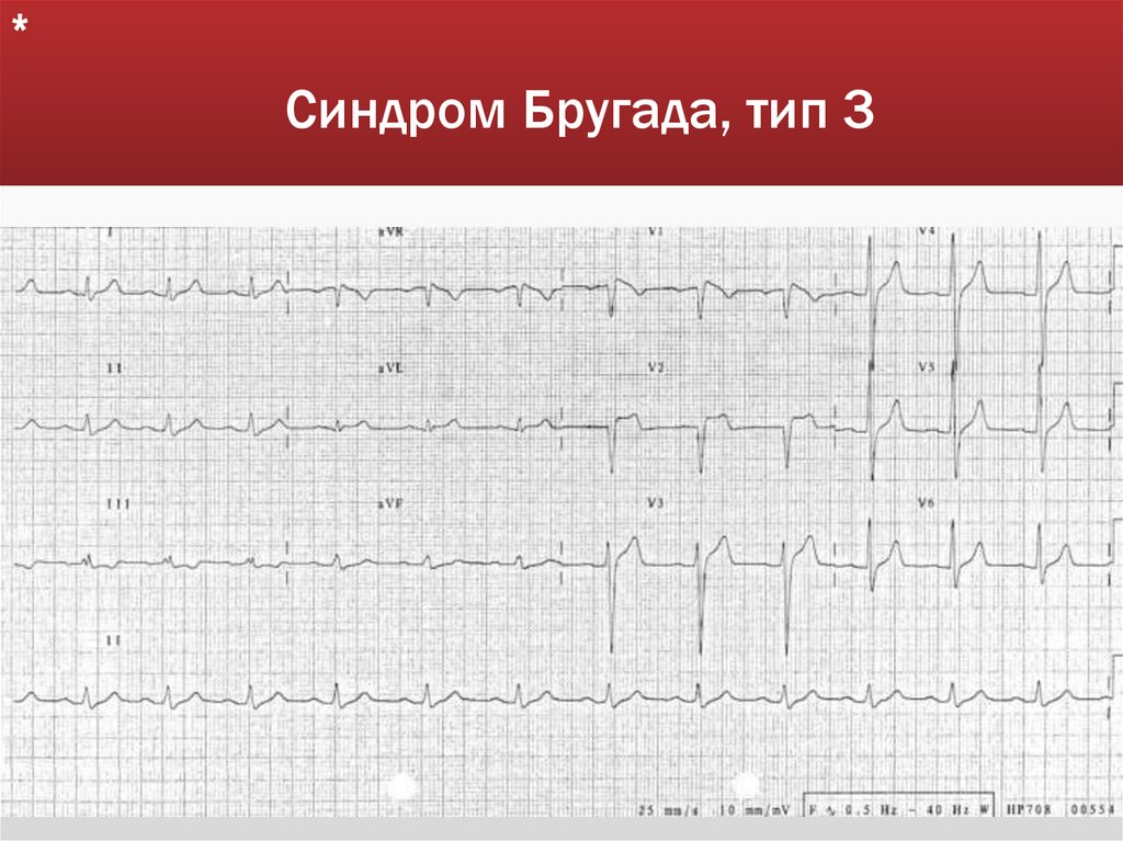Существует 3 типа ЭКГ-изменений при с-ме Бругада (ЭКГ 1). Изменения наблюдаются в
