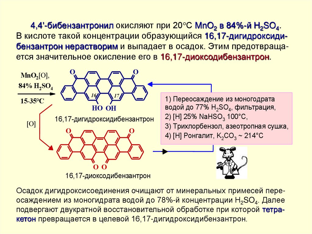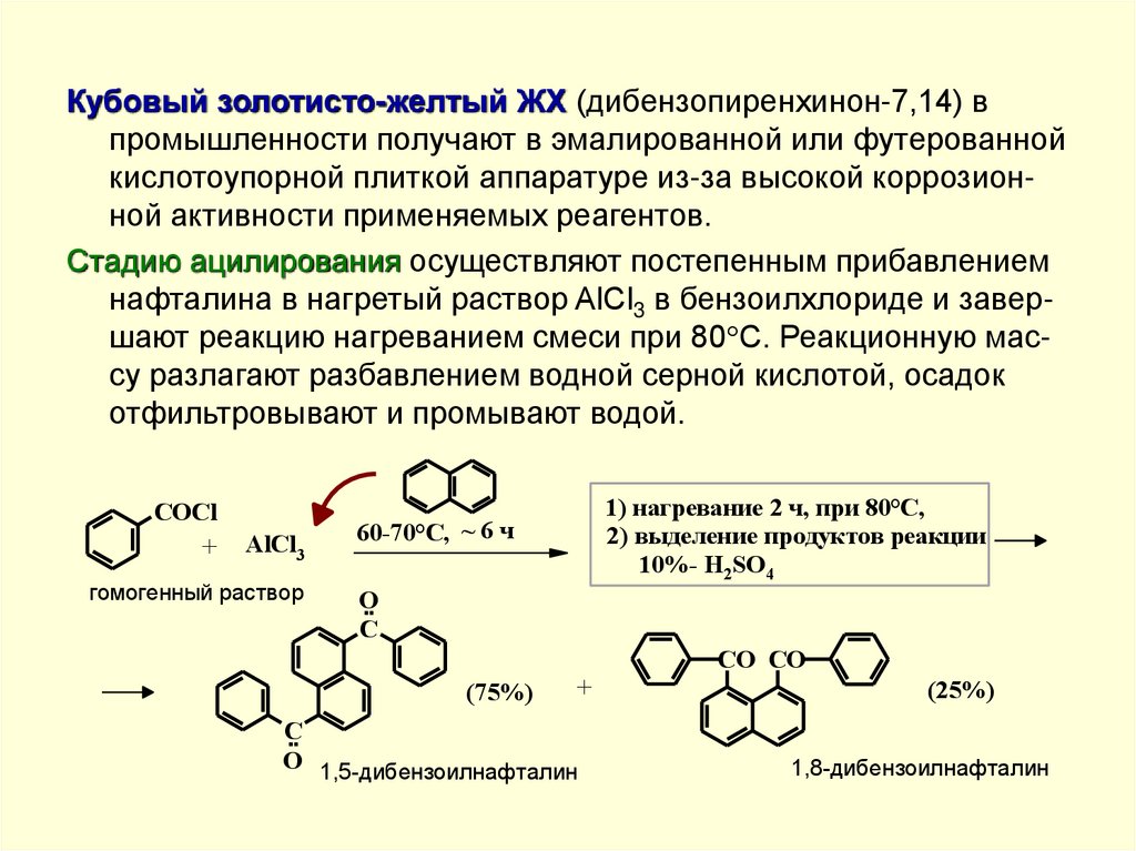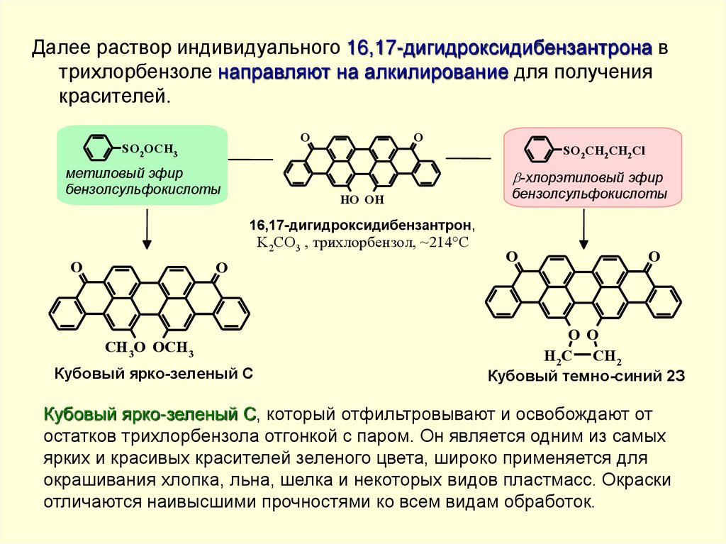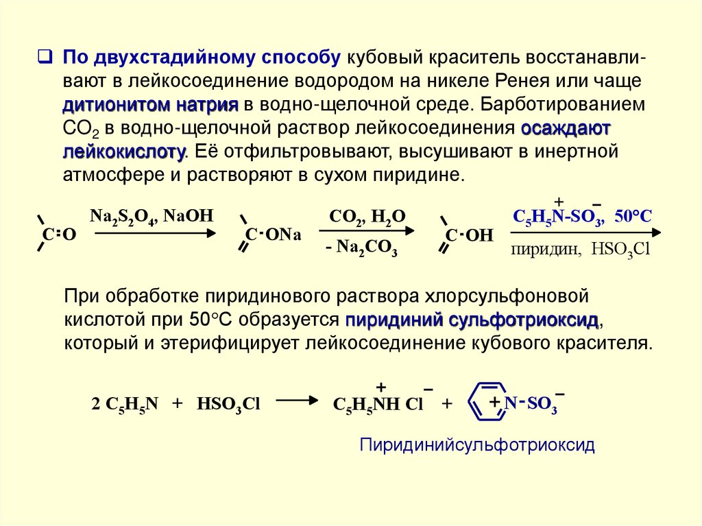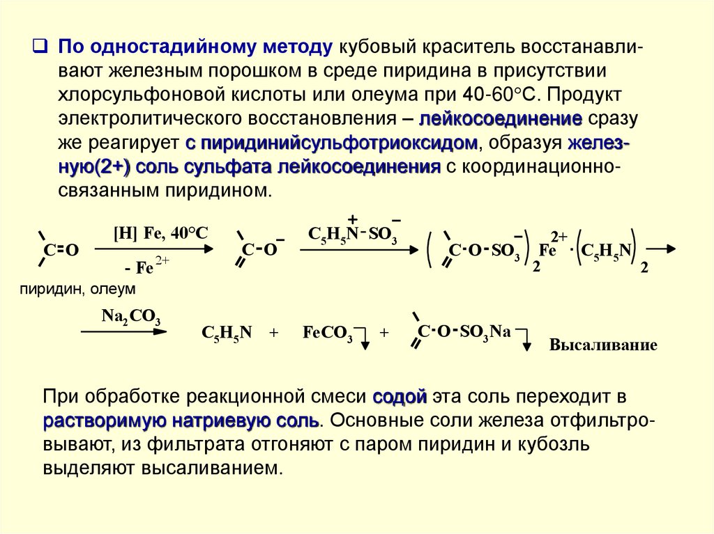 По одностадийному методу кубовый краситель восстанавливают железным порошком в среде пиридина в присутствиихлорсульфоновой кислоты или олеума при 40-60 С. Продукт