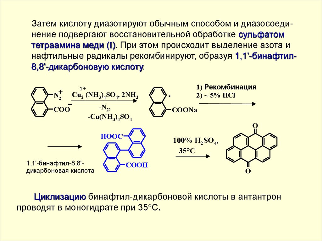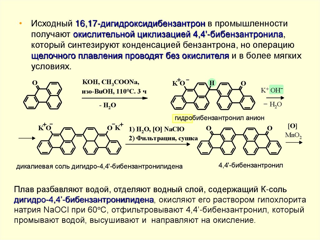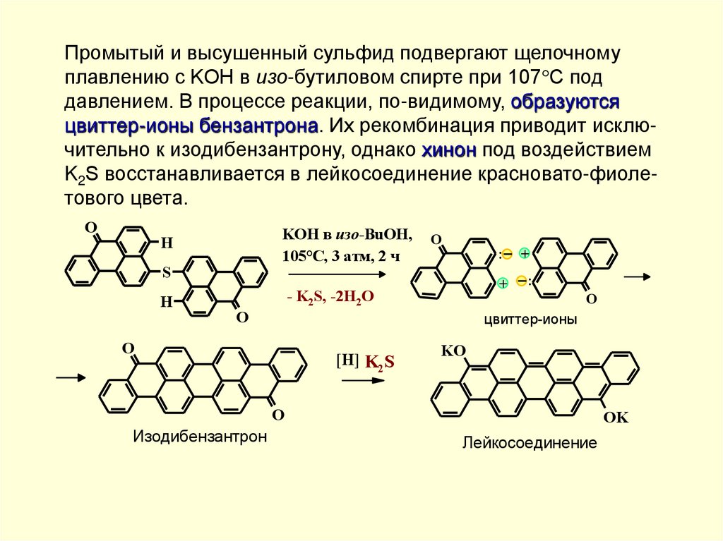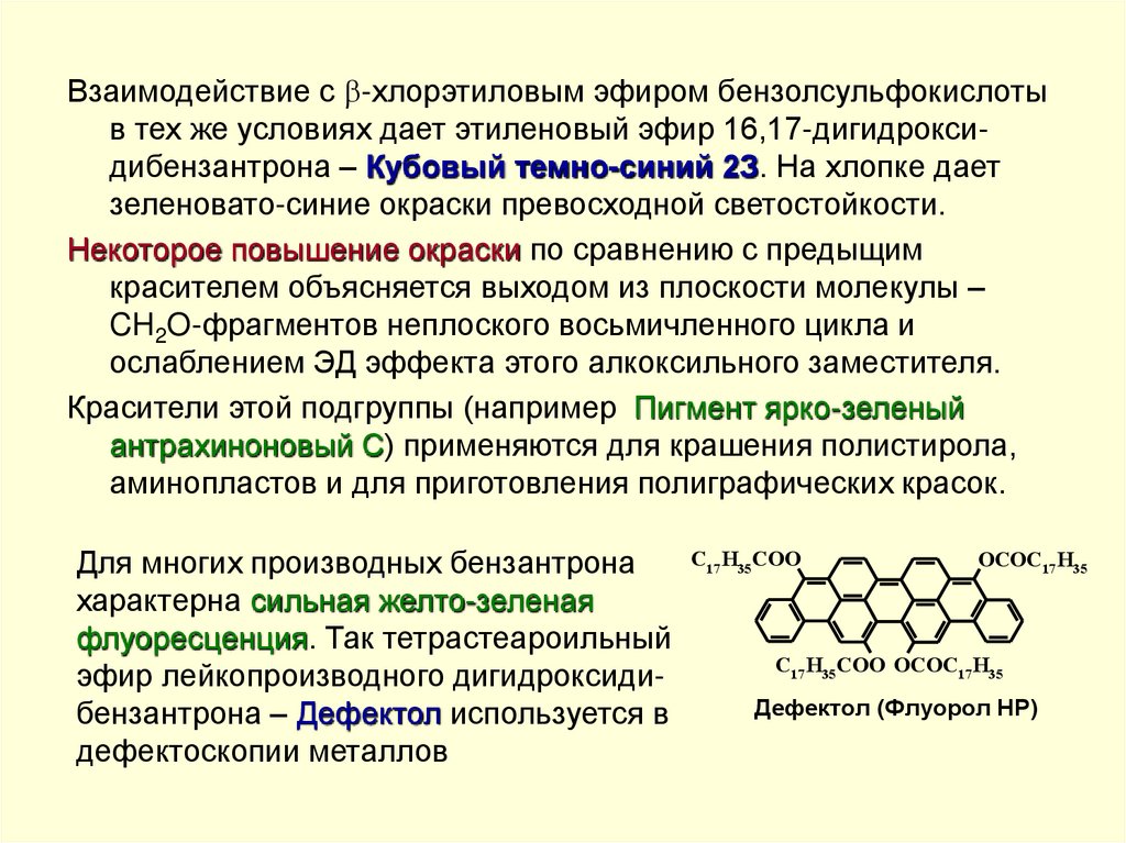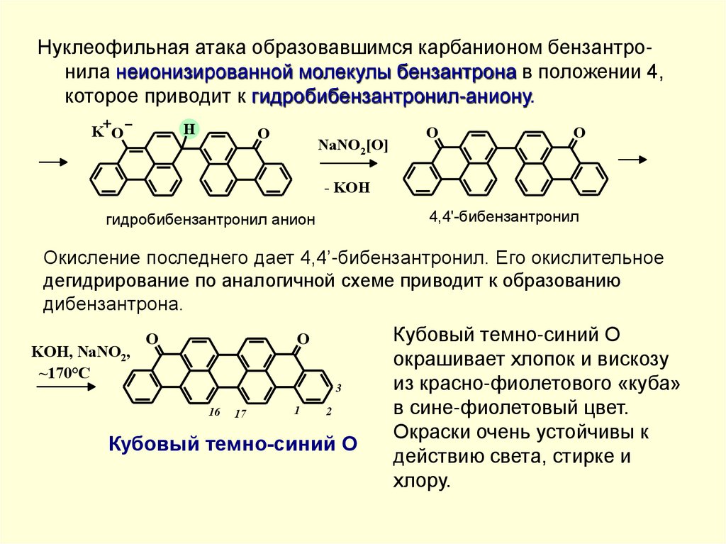 Поэтому полициклохиноны ряда антрона являются интенсивноокрашенными веществами. Цвет этих соединений (дибензпиренхинон - желтый, антантрон - оранжевый, дибензантрон синий и т.д.) в основном определяется протяженностью цепи