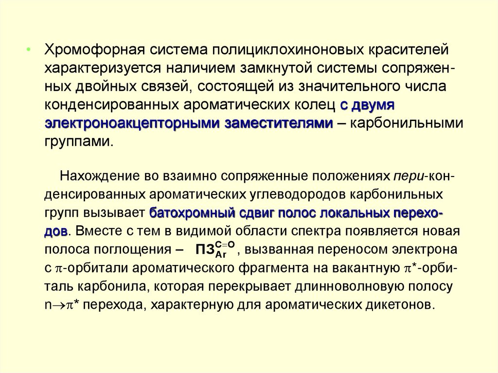• Хромофорная система полициклохиноновых красителейхарактеризуется наличием замкнутой системы сопряженных двойных связей, состоящей из значительного числа