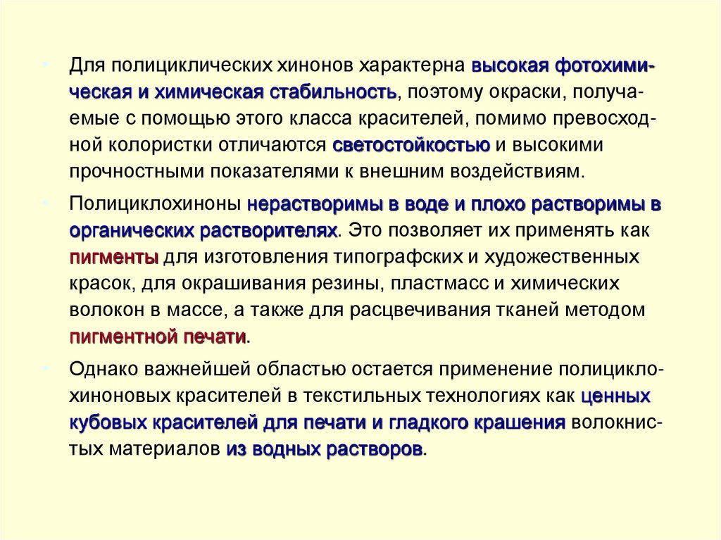 • Для полициклических хинонов характерна высокая фотохимическая и химическая стабильность, поэтому окраски, получаемые с помощью этого класса красителей, помимо превосходной колористки отличаются светостойкостью и высокимипрочностными показателями к внешним воздействиям.