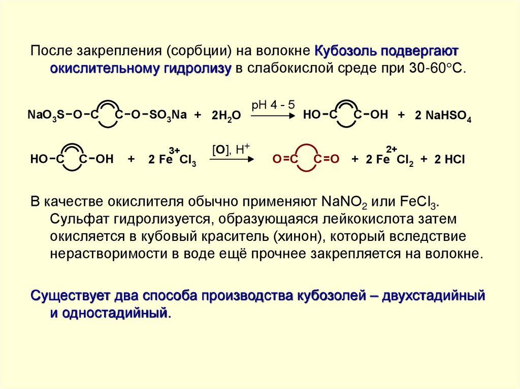 После закрепления (сорбции) на волокне Кубозоль подвергаютокислительному гидролизу в слабокислой среде при 30-60 С.