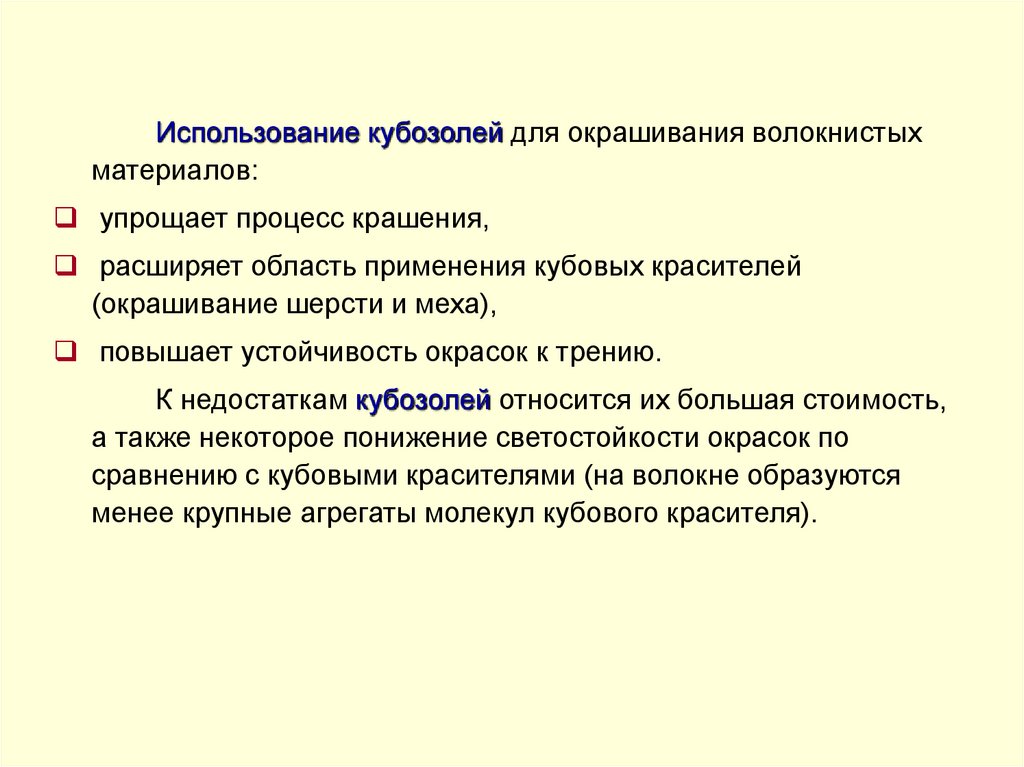 Использование кубозолей для окрашивания волокнистыхматериалов:
