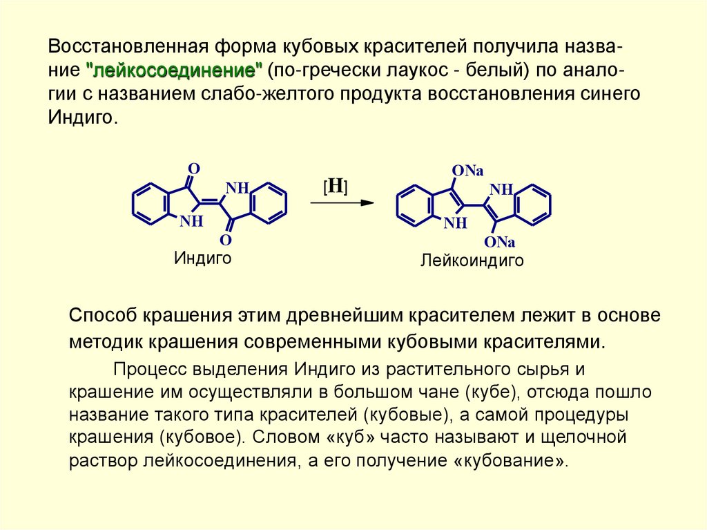 • В отличие от Индиго лейкосоединения кубовых красителей нетолько окрашены, но часто имеют более глубокую окраску, чем