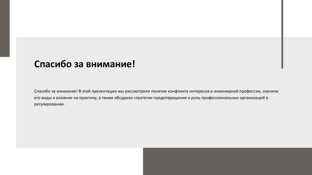 Спасибо за внимание!Спасибо за внимание! В этой презентации мы рассмотрели понятие конфликта интересов в инженерной профессии, изучили