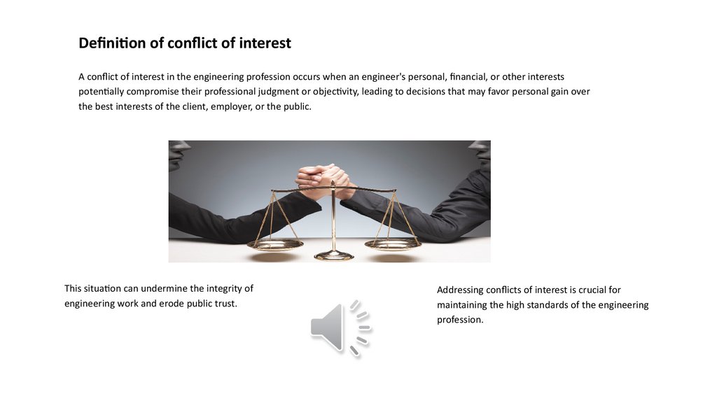 Definition of conflict of interestA conflict of interest in the engineering profession occurs when an engineer's personal, financial, or other interests