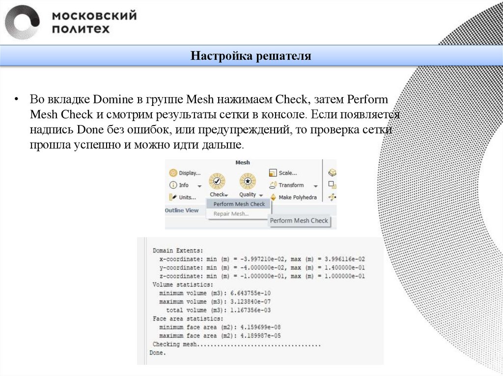 Настройка решателя• Во вкладке Domine в группе Mesh нажимаем Check, затем Perform