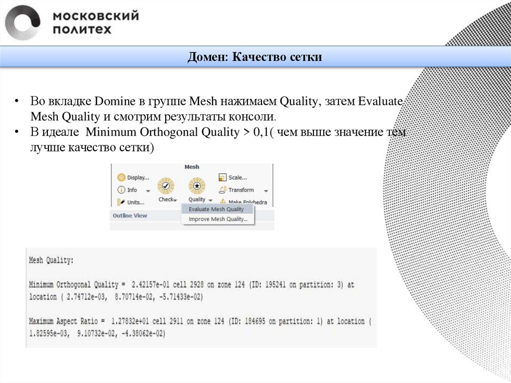 Домен: Качество сетки• Во вкладке Domine в группе Mesh нажимаем Quality, затем Evaluate