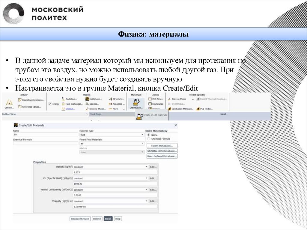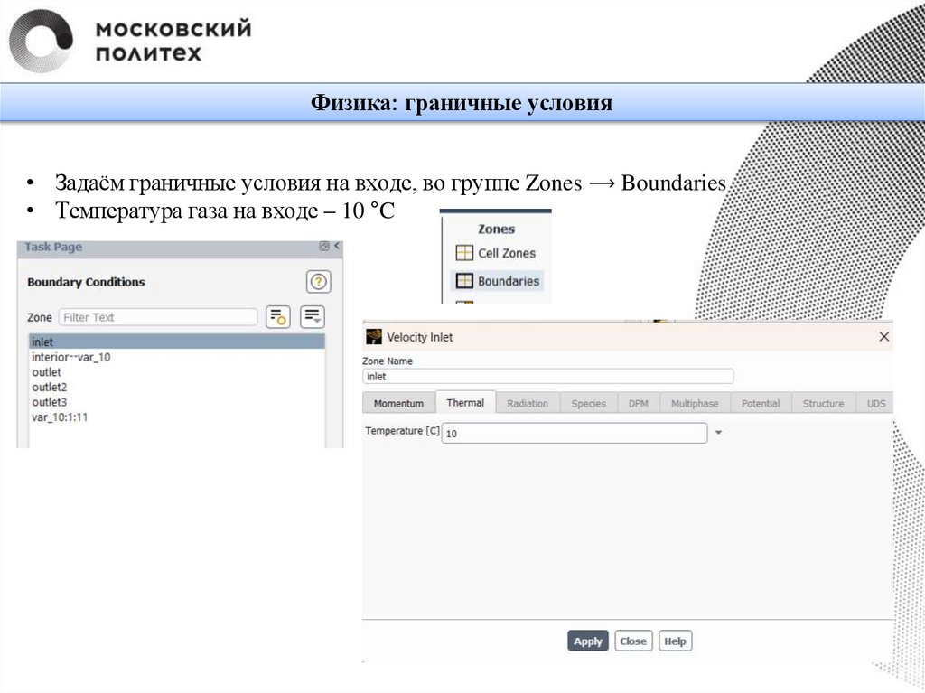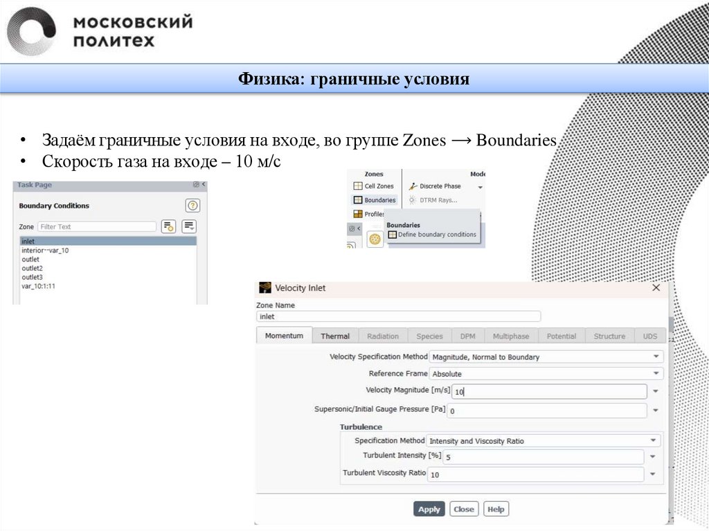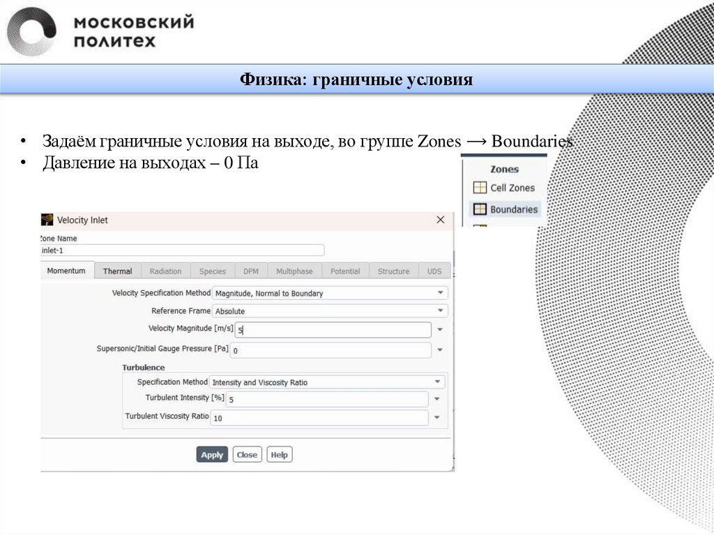 Физика: граничные условия• Задаём граничные условия на входе, во группе Zones ⟶ Boundaries