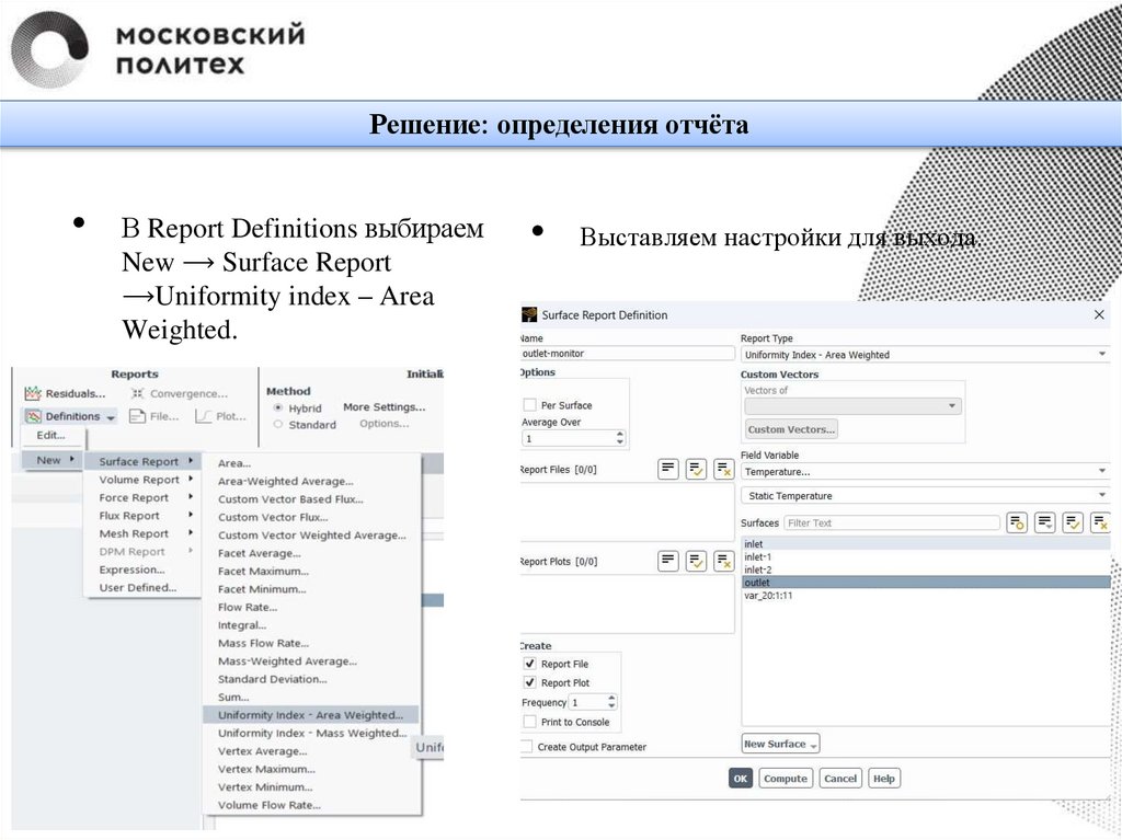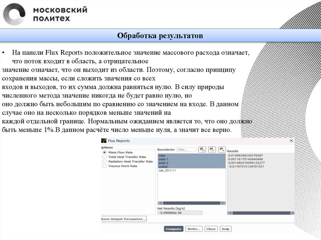Обработка результатовНа панели Flux Reports положительное значение массового расхода означает,