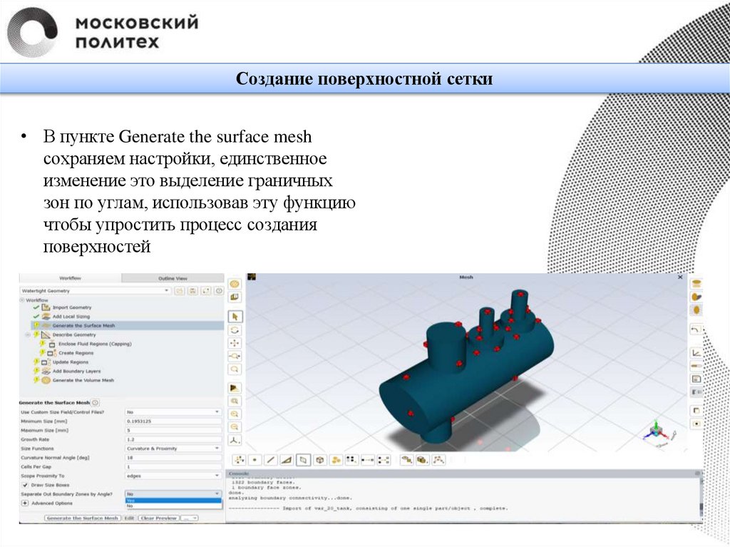 Создание поверхностной сетки• В пункте Generate the surface mesh