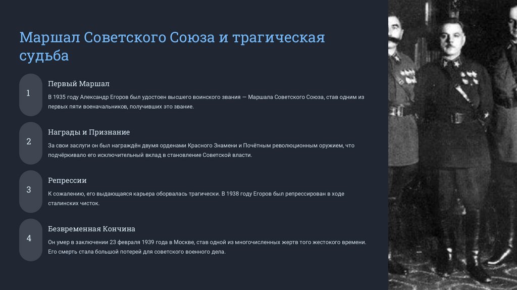 К сожалению, его выдающаяся карьера оборвалась трагически. В 1938 году Егоров был репрессирован в ходе