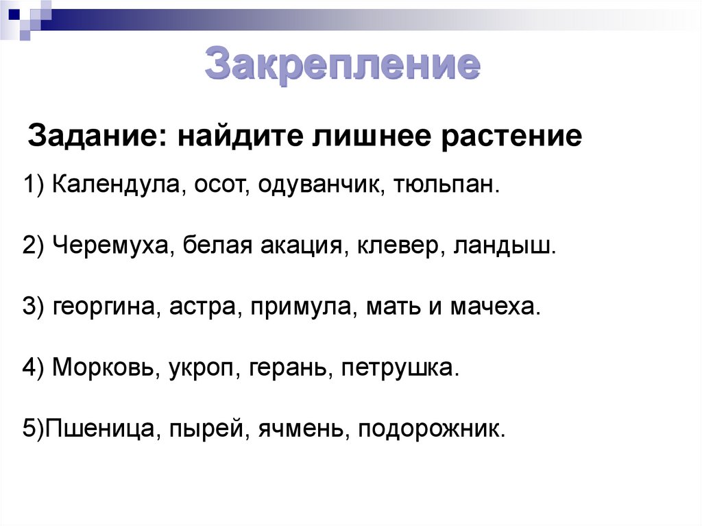 ЗакреплениеЗадание: найдите лишнее растение