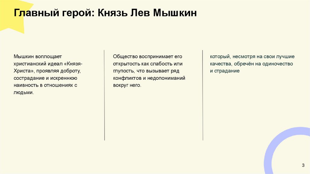 Главный герой: Князь Лев МышкинМышкин воплощает