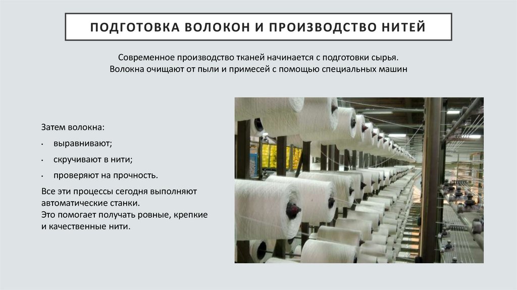 ПОДГОТОВКА ВОЛОКОН И ПРОИЗВОДСТВО НИТЕЙСовременное производство тканей начинается с подготовки сырья.