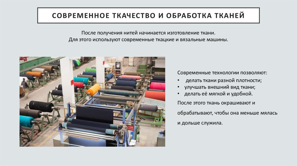 СОВРЕМЕННОЕ ТКАЧЕСТВО И ОБРАБОТКА ТКАНЕЙПосле получения нитей начинается изготовление ткани.