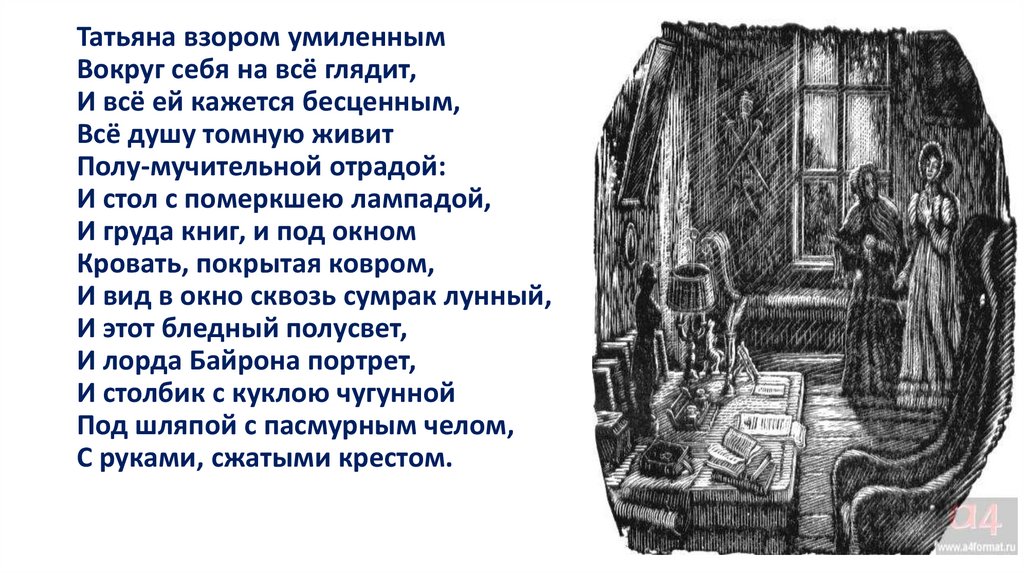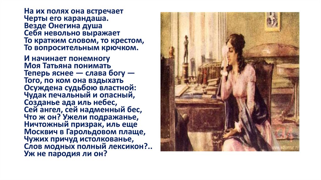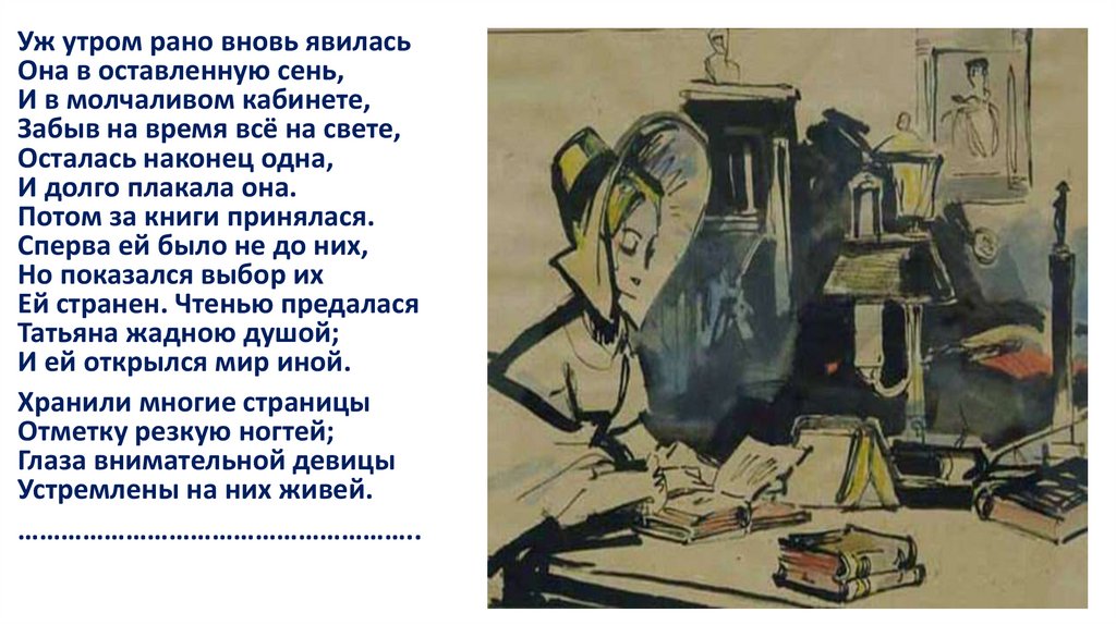 Татьяна случайно заходит в усадьбу Онегина, внимательно читает его книги и начинает